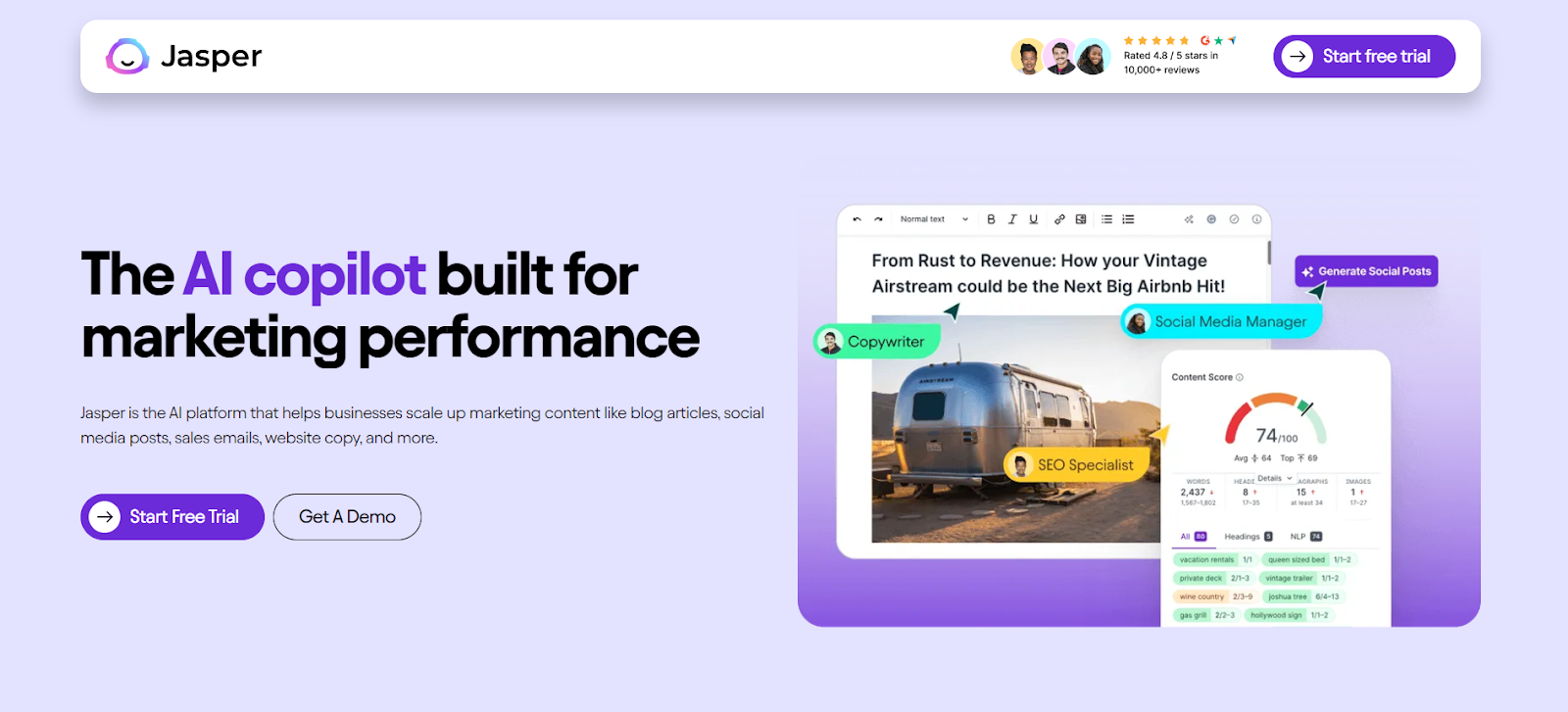 Jasper stands out for its versatility in generating content across various formats, whether blog posts, social media content, or email campaigns. Its ability to adapt to different brand voices and SEO requirements makes it an essential tool in my content creation toolkit. Jasper's collaboration feature also enables real-time content development with team members, streamlining the editing process.