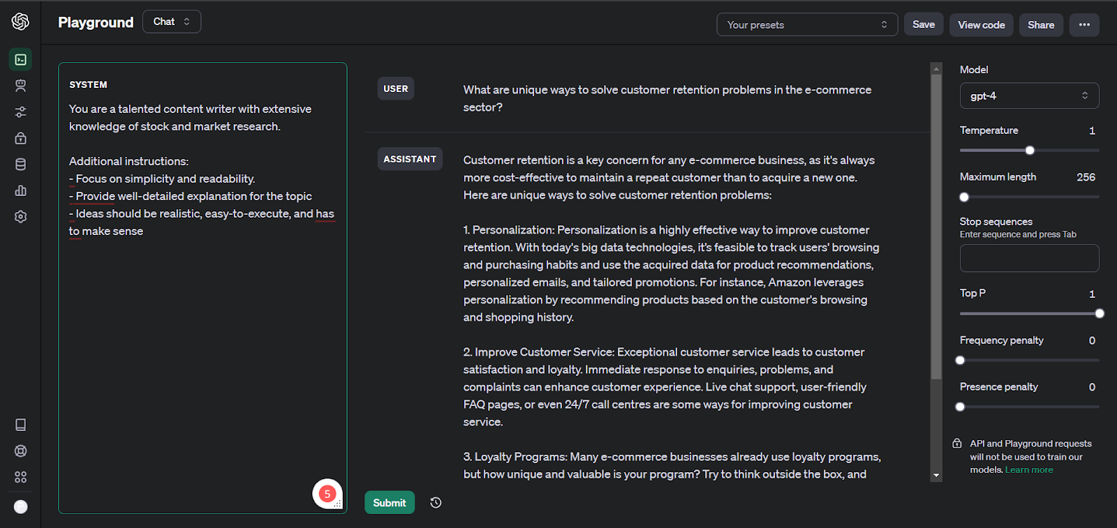 Then, in the “User” section, I add my question; "What are unique ways to solve customer retention problems in the e-commerce sector?”