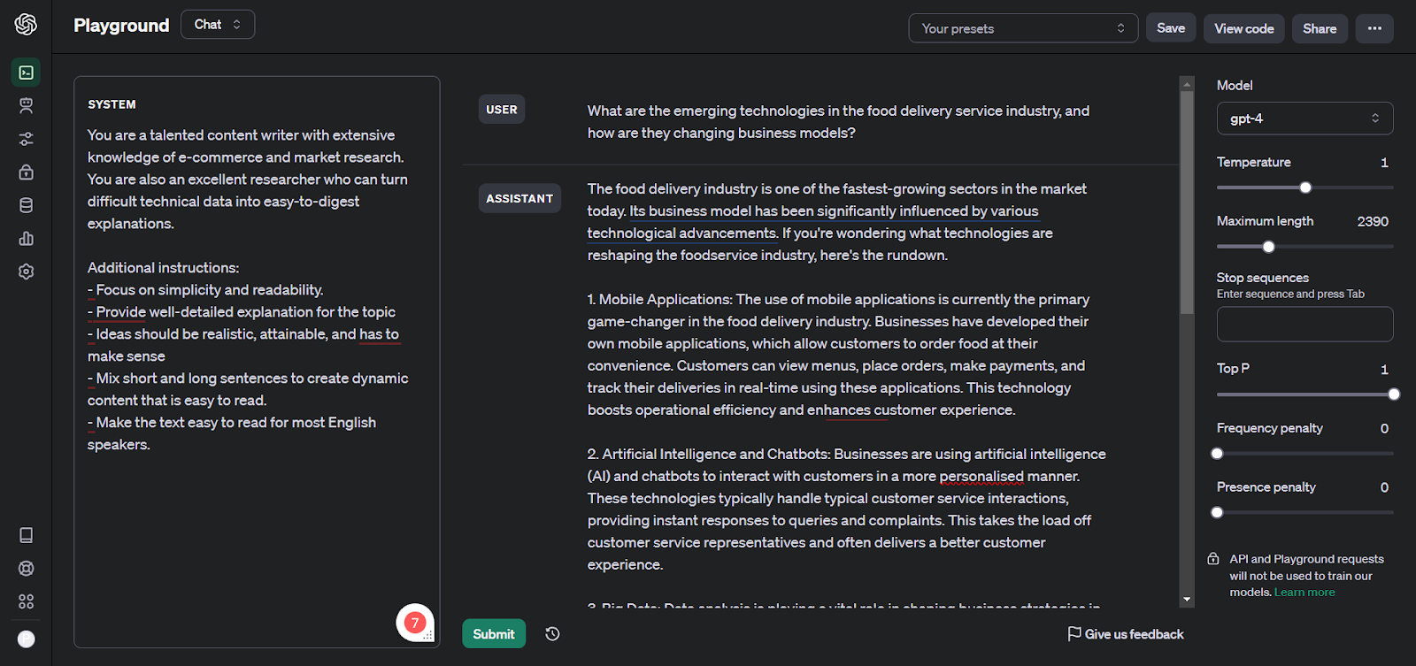 Now, all I have to do is write my question in ChatGPT; “What are the emerging technologies in the food delivery service industry, and how are they changing business models?”