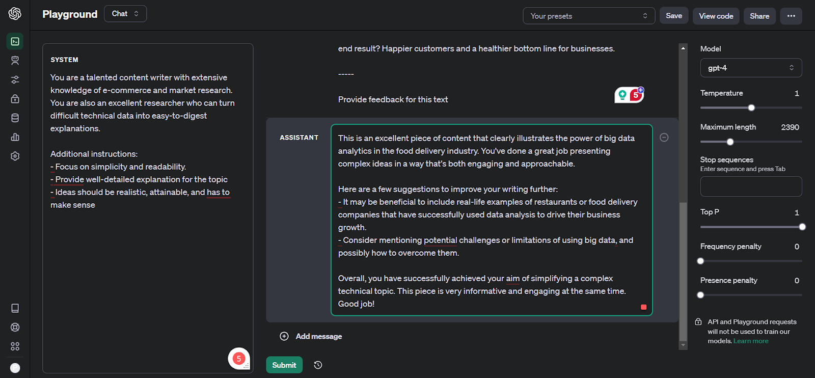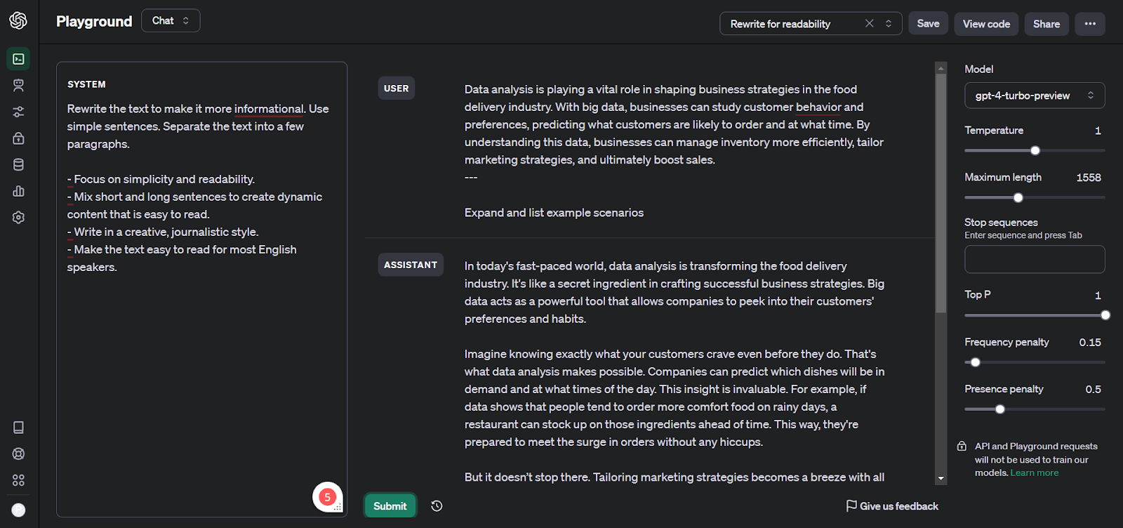 For example, if I need to expand and improve my discussion about how data analysis can help the food delivery business, I can ask ChatGPT for help by pasting the text I have in the “User” section.