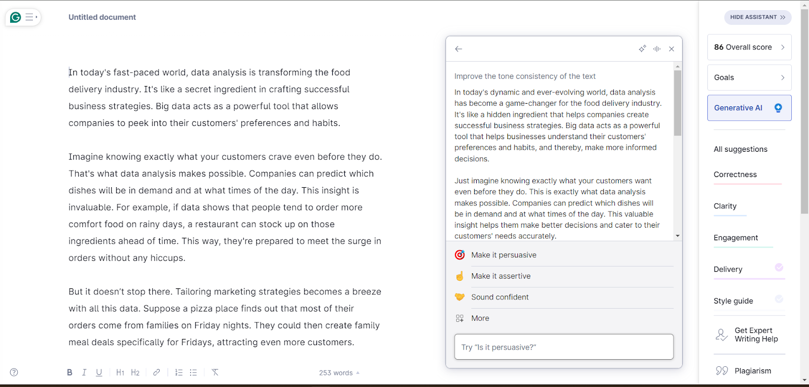 I use another tool, Grammarly, to improve the tone consistency of the text ChatGPT gave me earlier. Grammarly would then follow my instructions and improve my text for me.