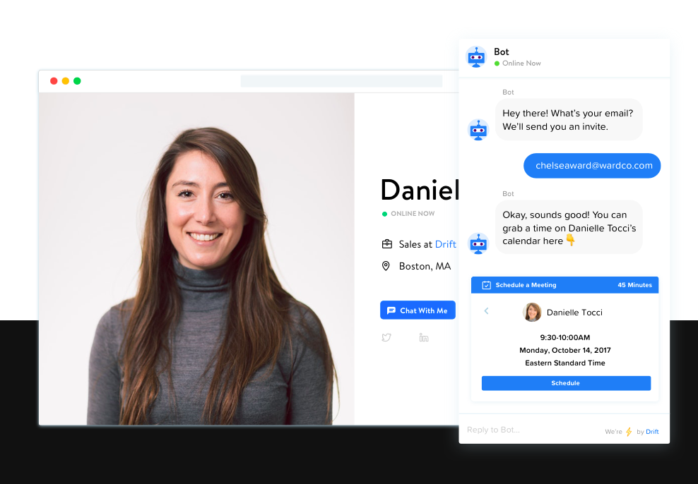 Chatbot platforms like Drift allow your business to move conversations with leads along the sales funnel by offering users the option to actually book a meeting with a member of your sales team. Through an integration with Google Calendar, the Drift Assistant uses AI to provide users with potential meeting times on your behalf, confirming them with you and providing reminders before they're scheduled to take place.