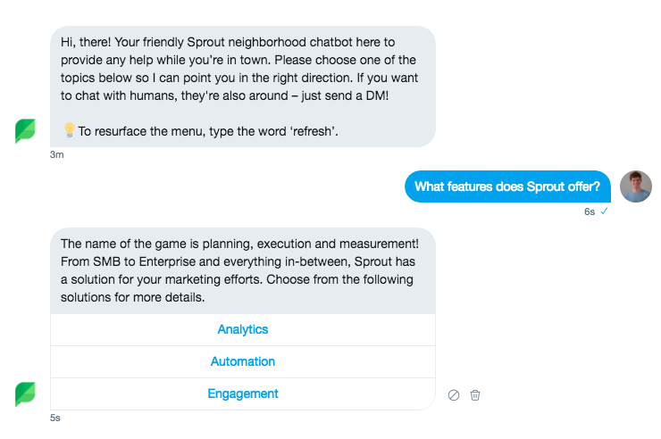 Not only are chatbots excellent at offering elevated customer service experiences, they're also fantastic information-gathering tools. Each customer conversation allows your business to build up a repository of real customer data--and the best part? It runs in the background while you focus on other tasks. Social media marketers at Sprout Social are using their chatbot to determine what people who are landing on their website are looking for and are able to point them in the right direction based on their response.