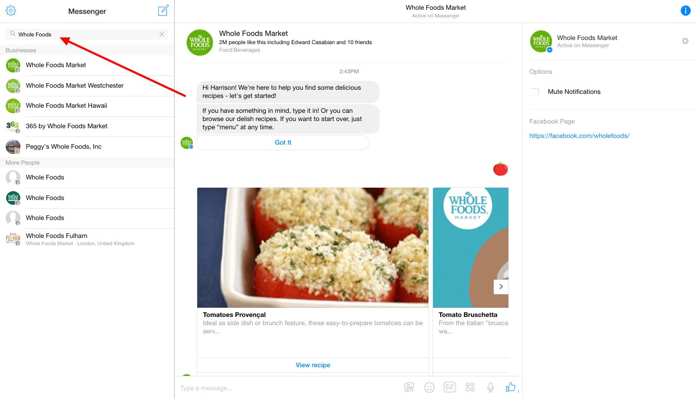 Chatbots built through Facebook Messenger, like that of organics superstore Whole Foods, take this personalization a step further. In the interaction with users, Facebook actually allows the bot to read and respond to them by name, catering to the type of information that users are looking for. In addition to sharing more information about the business itself, the Whole Foods chatbot also taps into experiential marketing by allowing users to search for recipes by entering emojis into the chat field.