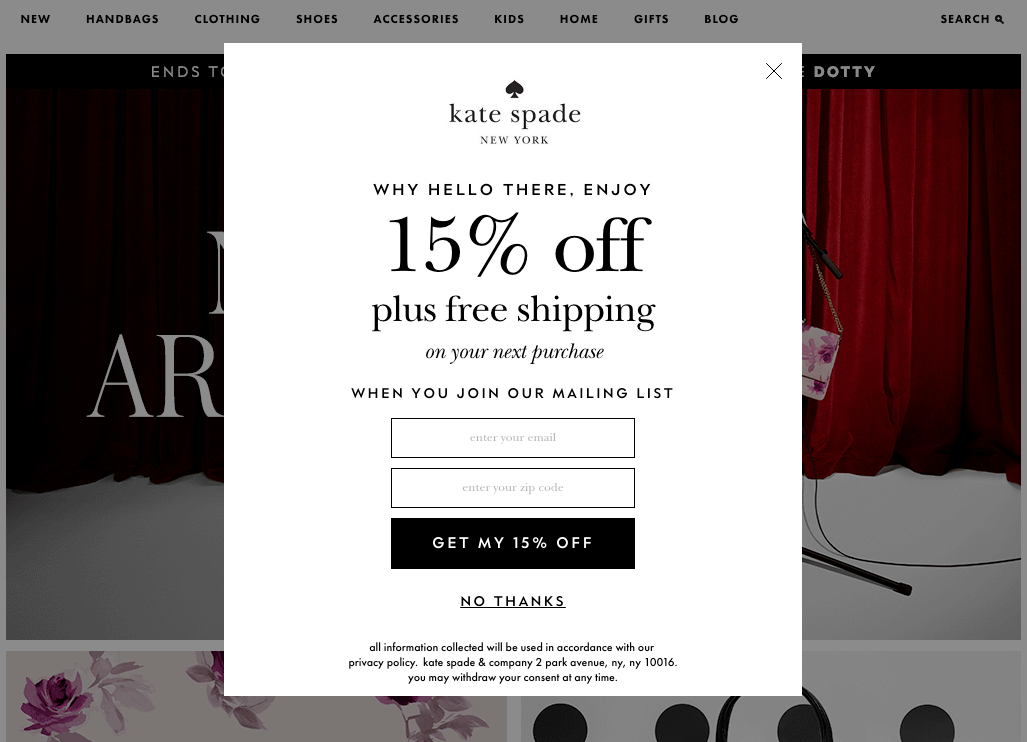 Designer brand Kate Spade does this well--their e-commerce website offers a deal that users can’t refuse if they choose to sign up for the brand’s email list. Through this email capture, Kate Spade has the ability to send leads mail based on their most recent engagement with the website, to make them aware of upcoming sales, and to bring the brand top of mind when time has passed between customer engagement.