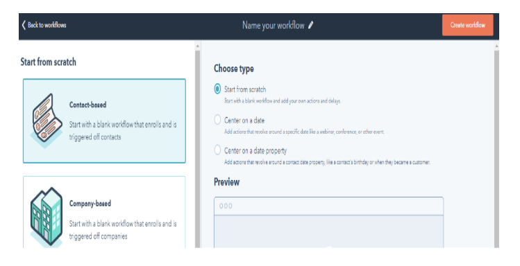 - Once you visit the Workflow dashboard, choose your workflow type like contact based workflow according to your requirements.