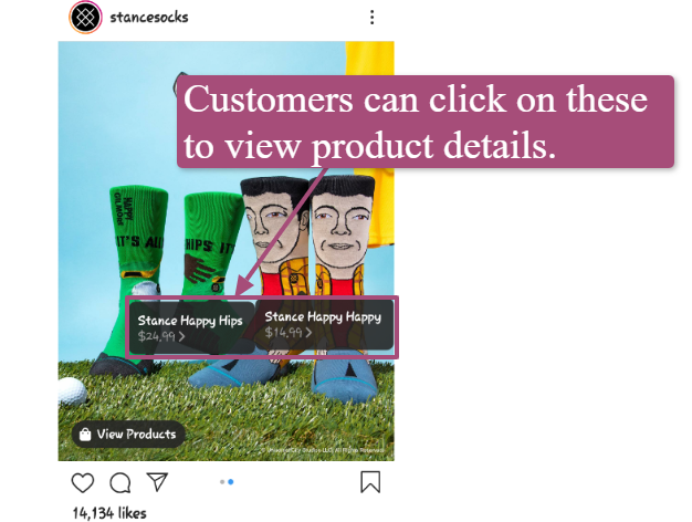For instance, you can create shoppable posts on your Instagram account. Here’s an example of what it looks like when your customers click on your shoppable posts using their mobile devices.