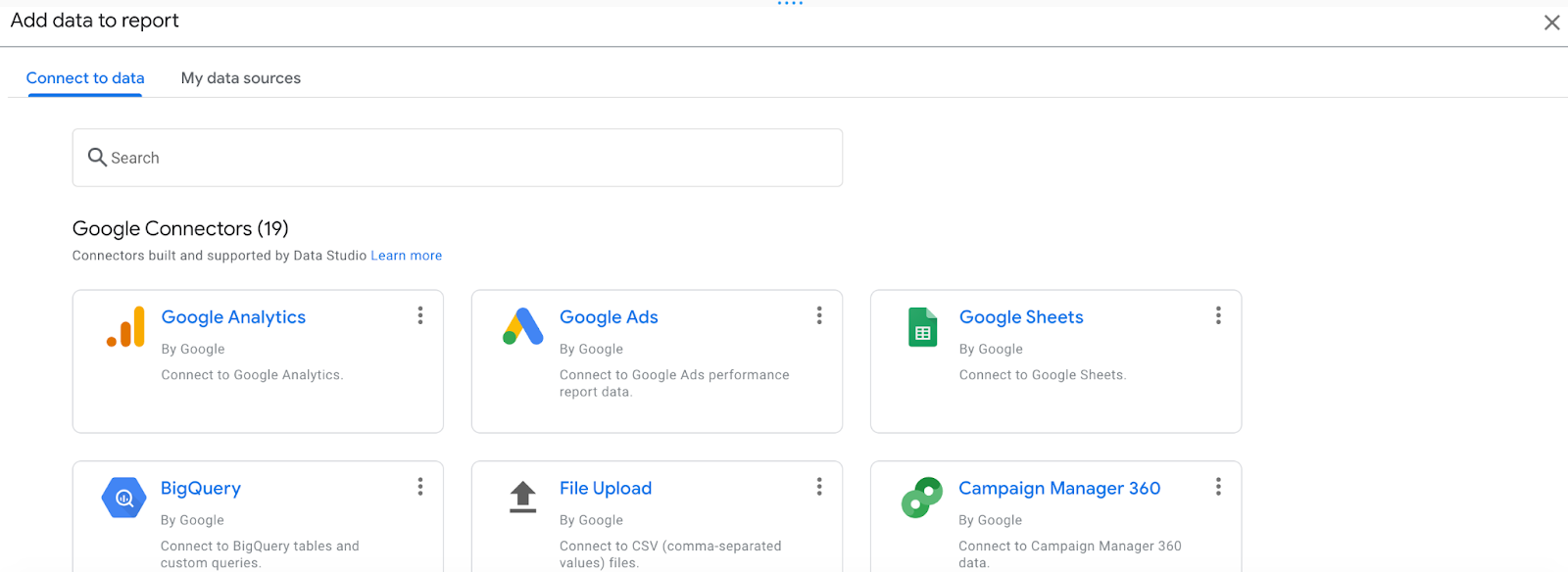 Also, you can add data from a variety of sources, as you can read in the Data Studio Help Center. These are some of the available options: