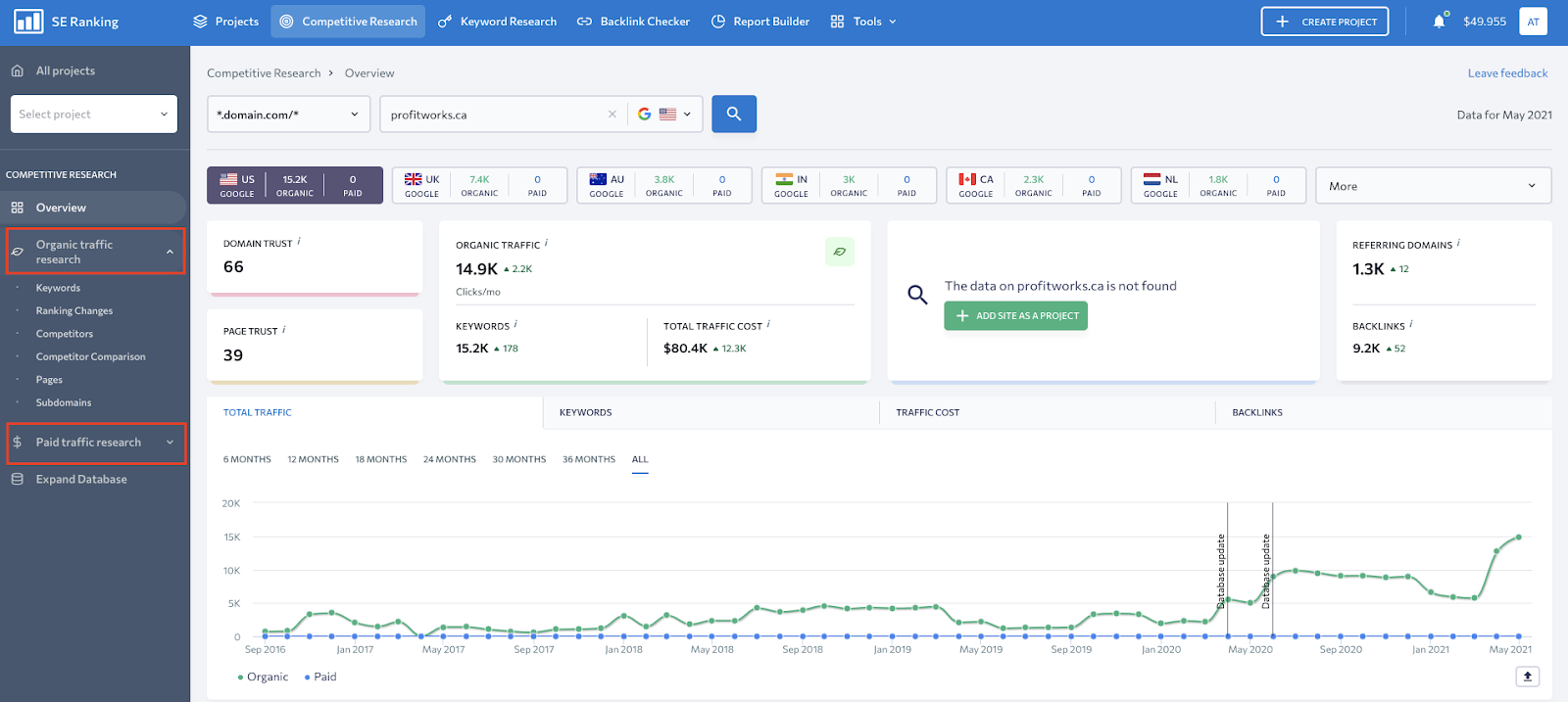 - Analyze your competitors. You can get the Competitor Review report by Profitworks or with SE Ranking Competitor Research tool that extracts organic and paid competitor data. Using SE Ranking, pay attention to the number of common keywords to define your primary competitors. Once you spot your competitors, analyze the keywords they rank for, check SERP positions, their top pages, and PPC strategy.