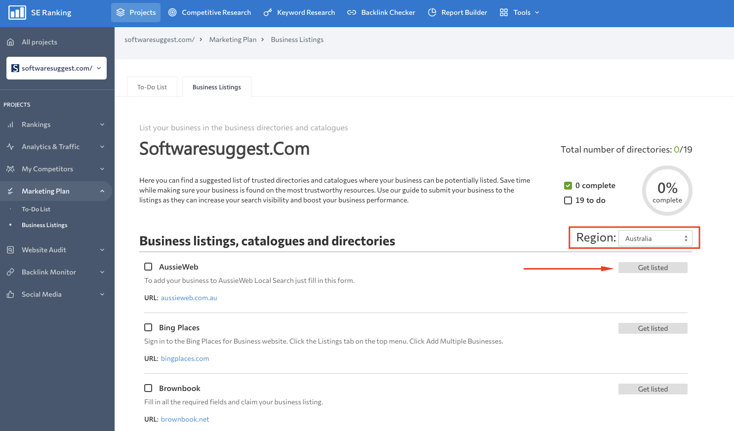 There are tones of listings that help you to find catalogs and business directories for a start. Some SEO platforms also have their own lists. For example, SE Ranking has the base by regions.