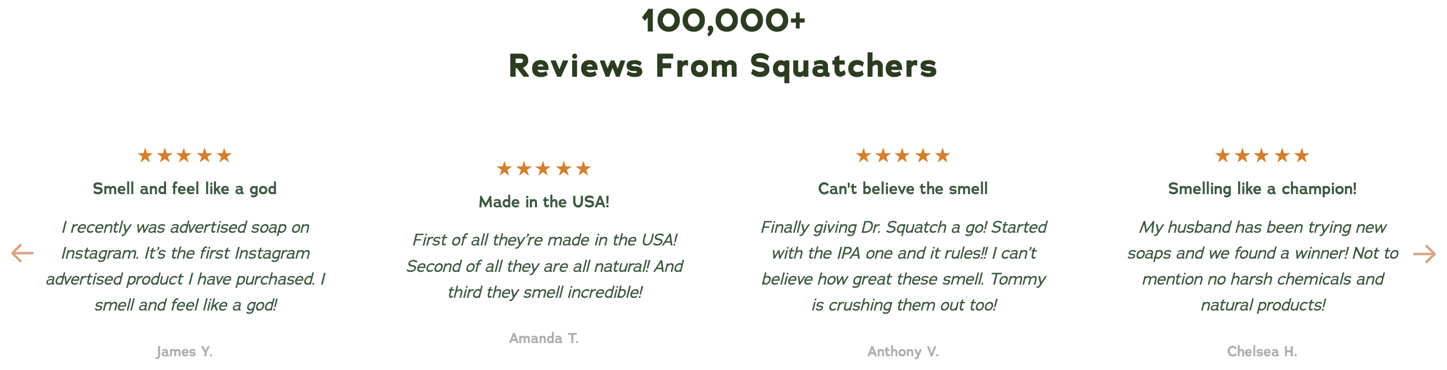 Having your customer reviews clearly depicted on your website's homepage, as Dr. Squatch has done, is a smart move. Not only does it demonstrate the quality of your product or business but it also helps customers feel confident about it.