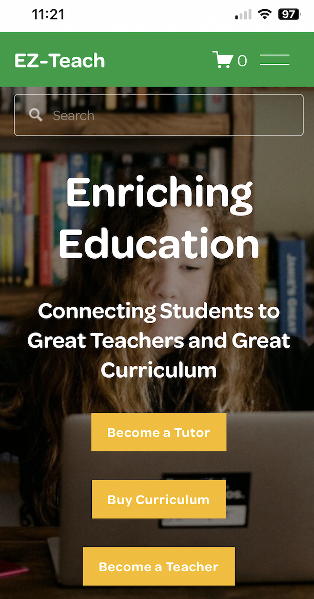As you can see, this page has shrunk in size to perfectly fit a smaller screen size, such as a cell phone. Also, as mentioned previously, this homepage also includes clear calls to action with the "Become a Tutor", "Buy Curriculum", and "Become a Teacher" buttons.