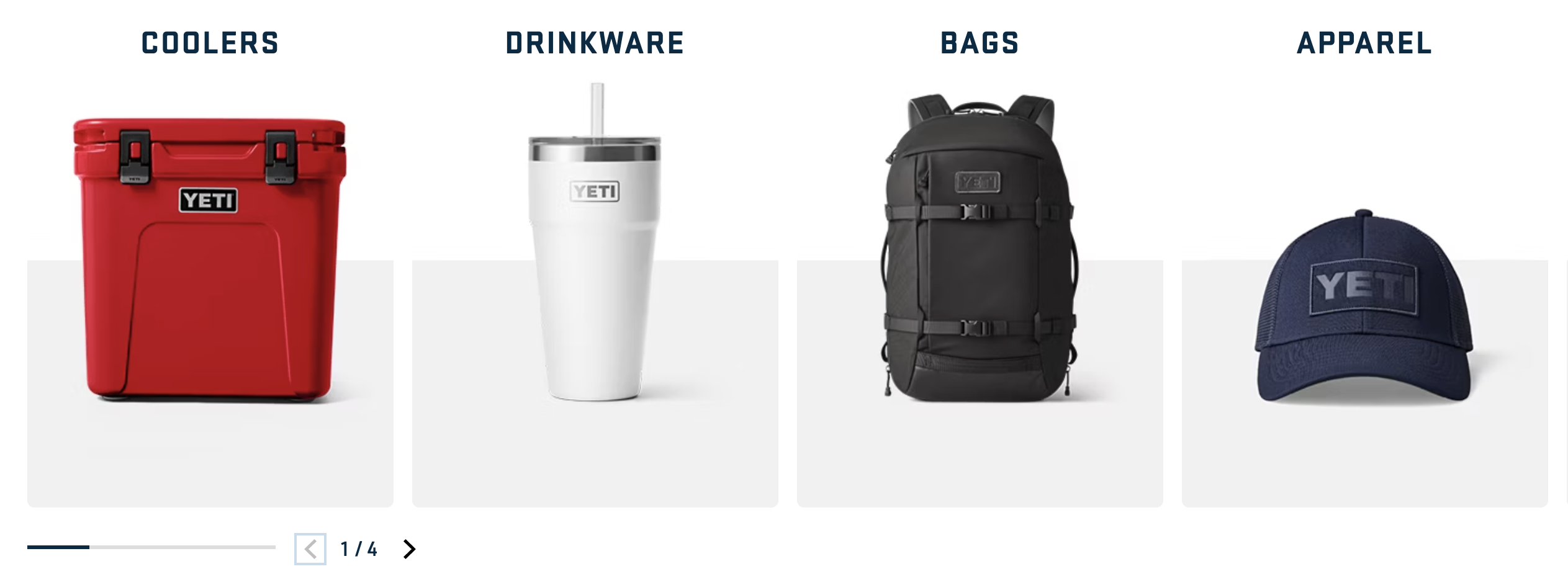 This homepage lists Yeti's products clearly which makes it easy for customers to navigate their website and find what they are looking for.