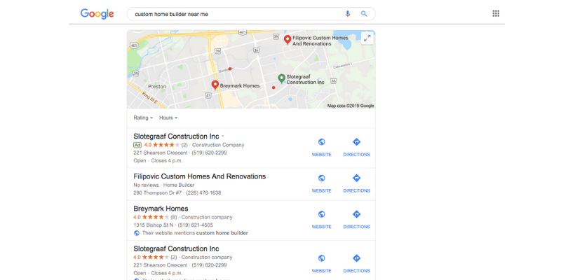 A Google My Business listing is one of the best ways to increase the chances of your business displaying in Google results for your product or service. With the rise of mobile usage and voice search, more and more customers are searching for location-based keywords, including "custom home builders near me." With a Google My Business listing, Google will recognize the location of your business and is more likely to share your brand a result for people searching in your area.